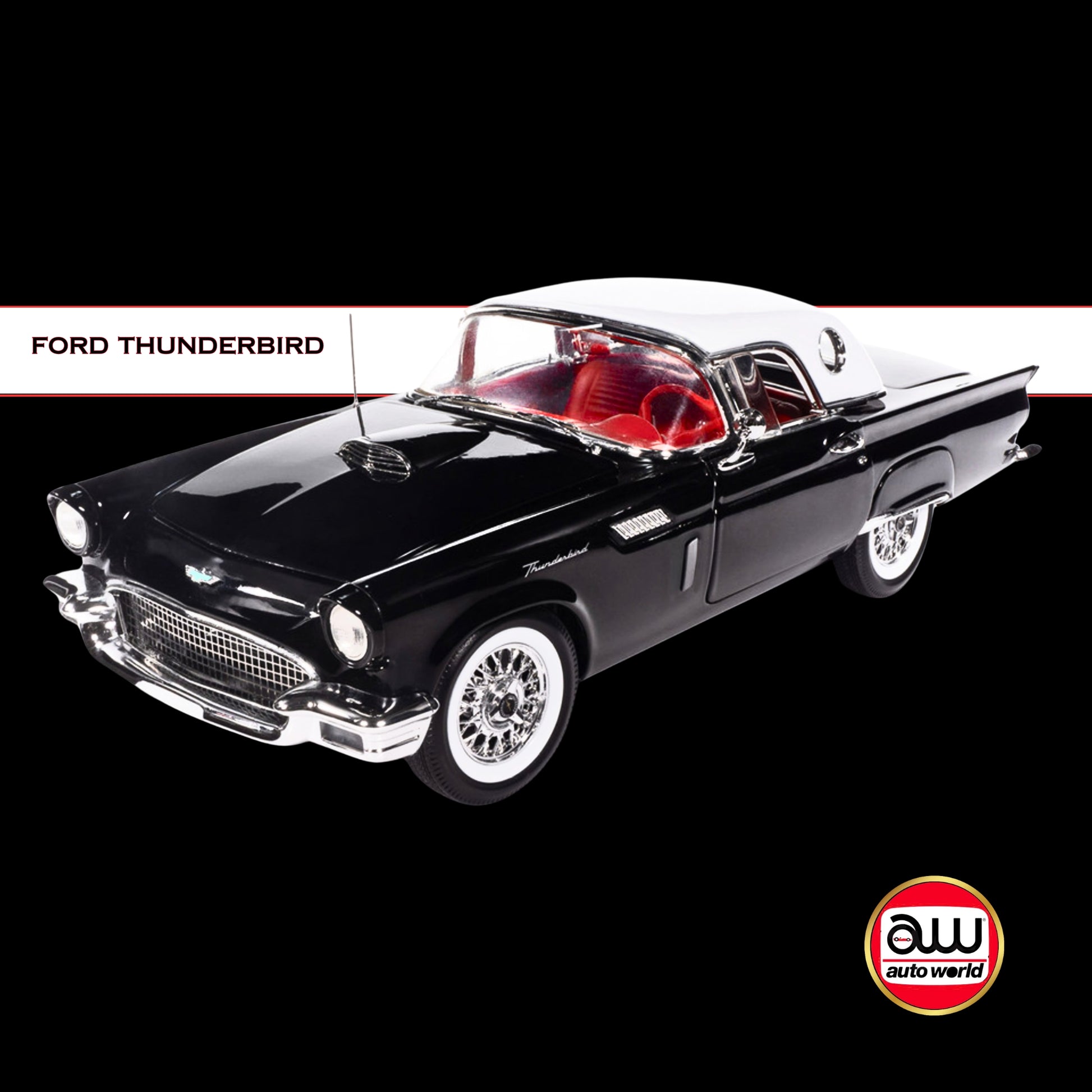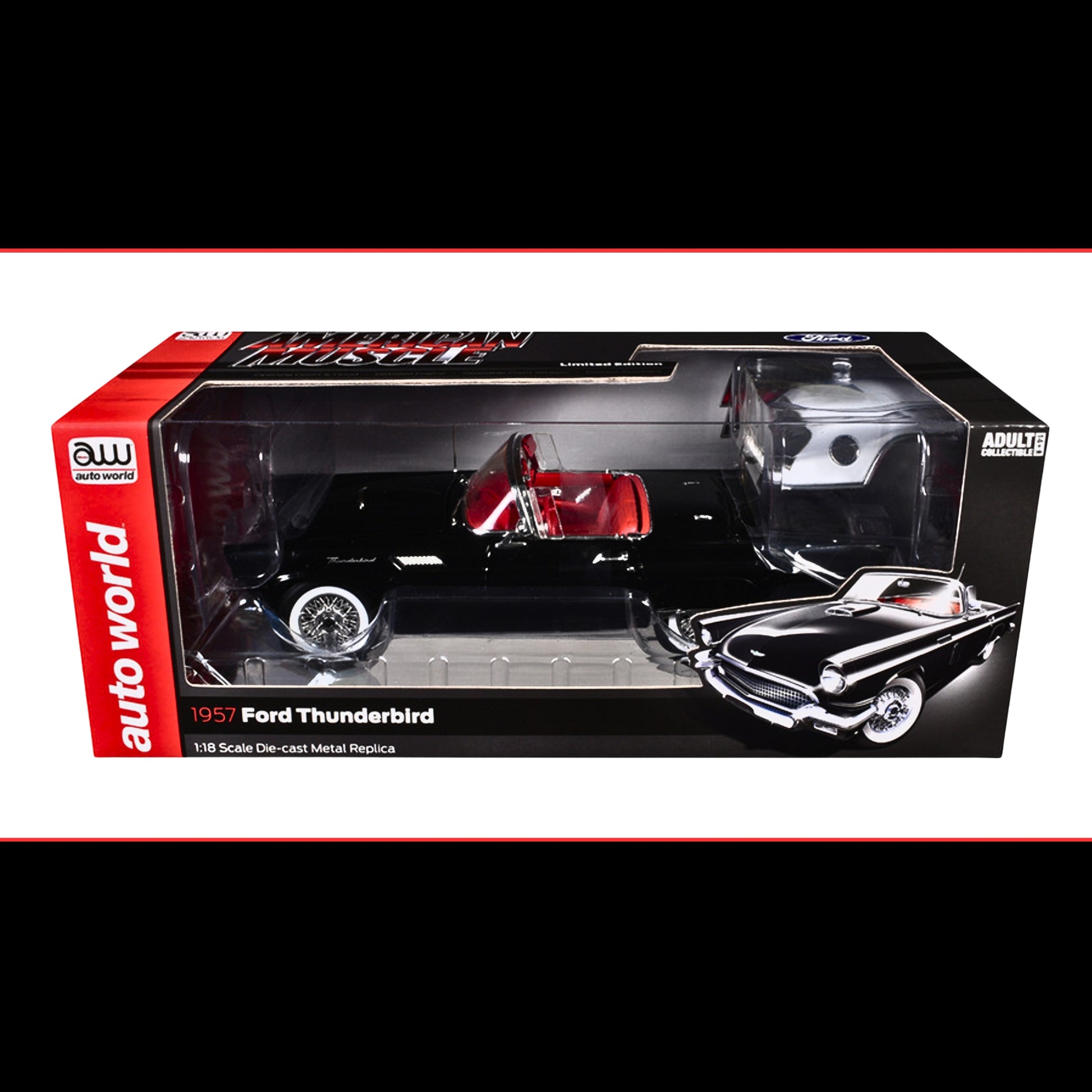 Auto World 1957 Ford Thunderbird Black w/ White Top & Red Interior 1/18 Diecast Model Car (American Muscle)