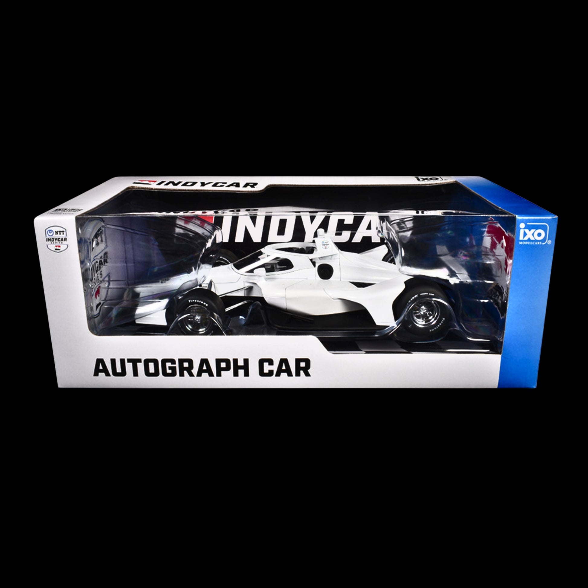 Dallara IndyCar blank white “Autograph Car” 1:18 diecast model by IXO Models in super speedway configuration. Limited edition NTT IndyCar Series collectible with chrome accents, real rubber tires and true-to-scale detail—perfect for signatures and serious racing collectors.